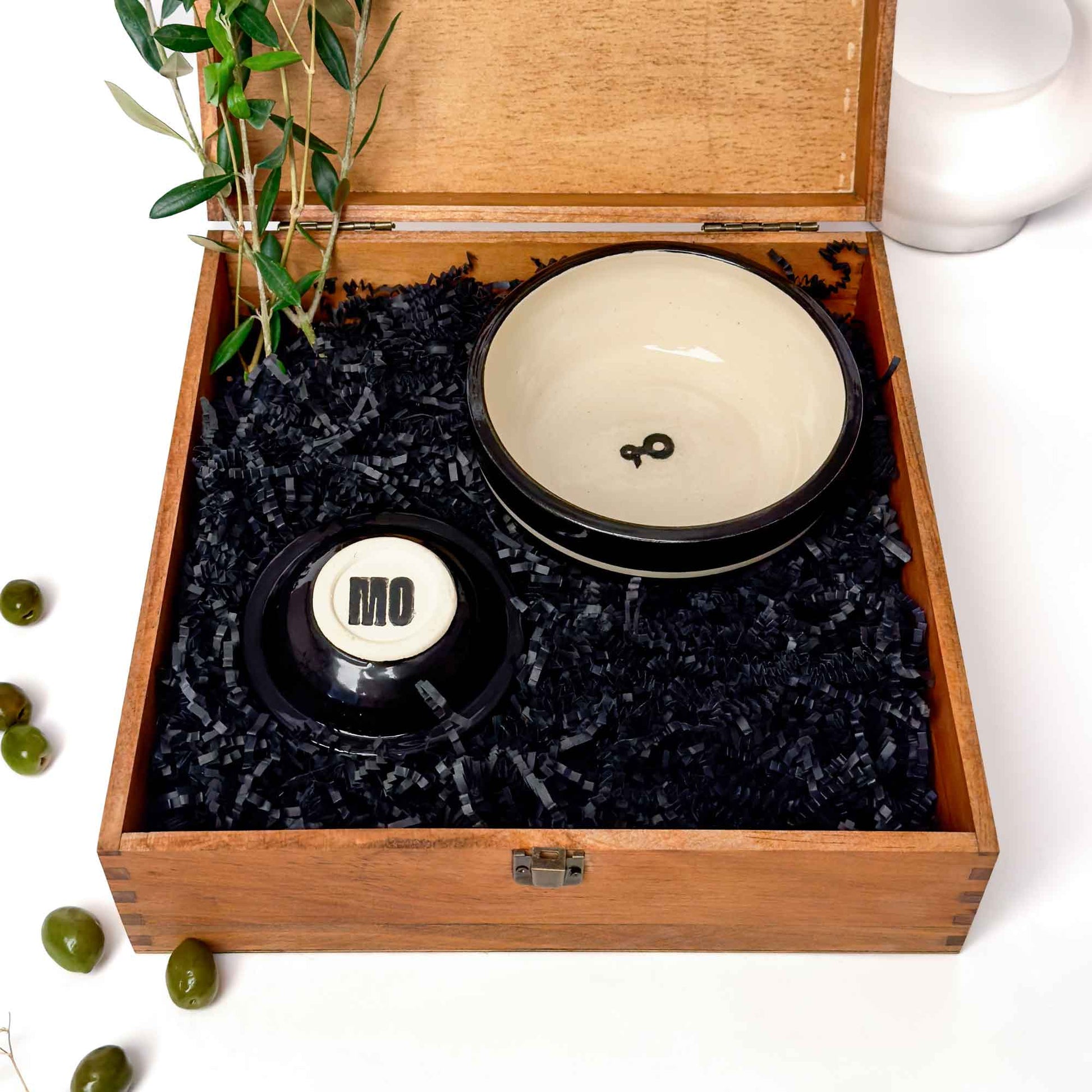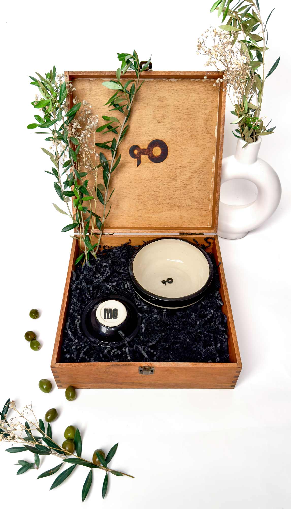 • One smaller dish, perfect for olives, za’atar, olive oil, or any condiment of your choice